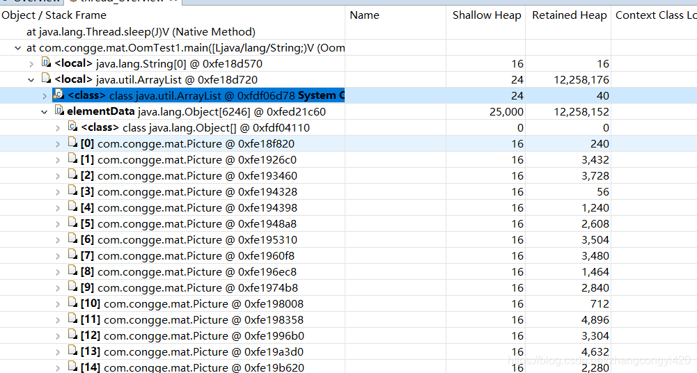 以main线程为例,列举出了里面的成员变量的信息,比如在当前的main线程中,有2个成员变量,其中一个集合里面包括了很多Picture对象
