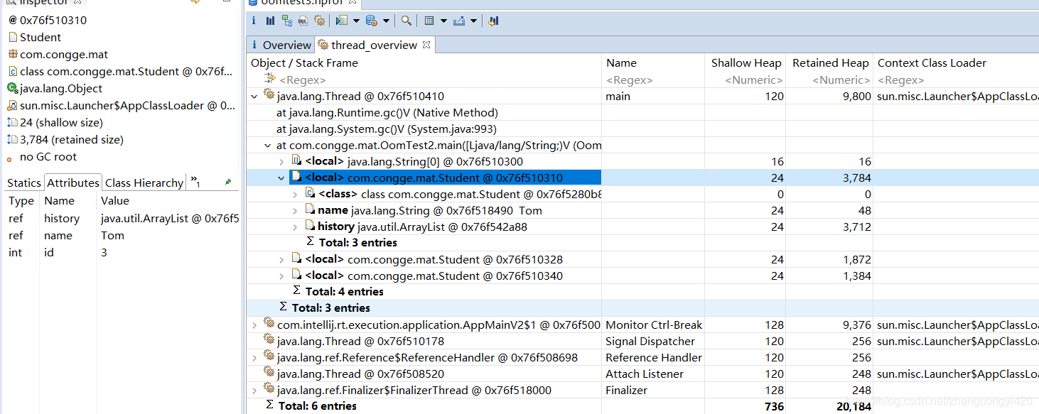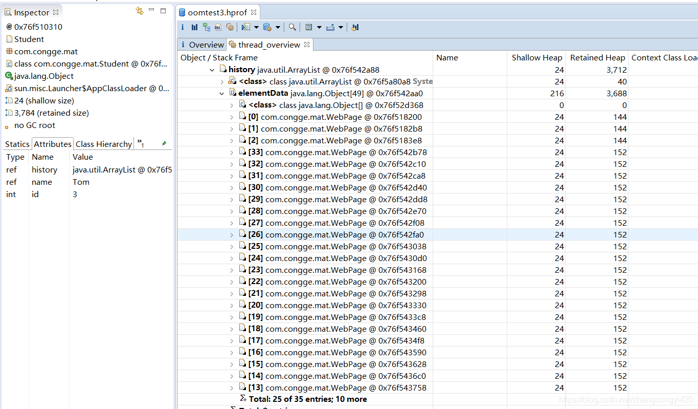 然后使用MAT打开该文件,从Thread Overview中,可以清楚的看到,目前存在的3个对象,Tom,Jerry和Lily