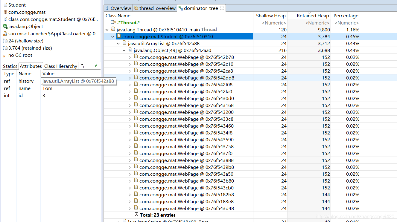 比如从支配树中,通过Thread定位到Tom,这时候发现集合中的对象个数只有23个,比上面少了2个,这个就是在支配树中,该对象真实支配的对象个数,多出来的2个被Jerry或Lily对象引用了