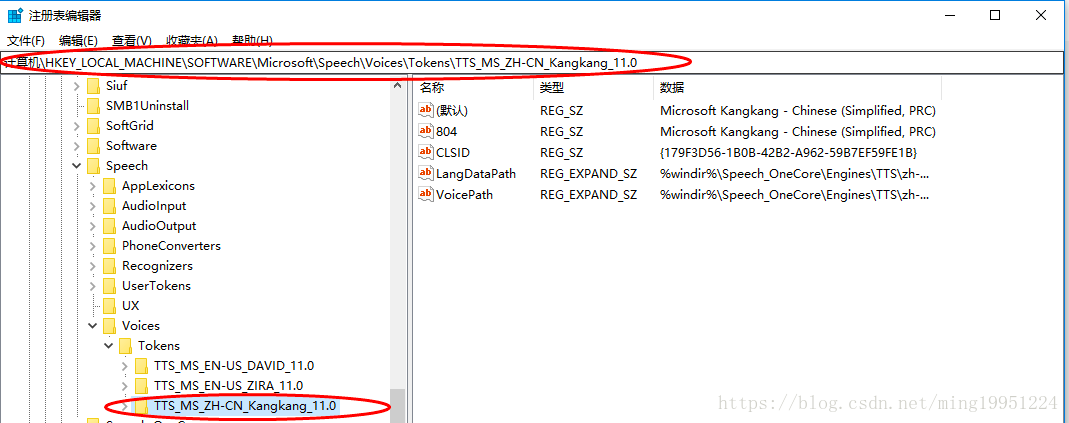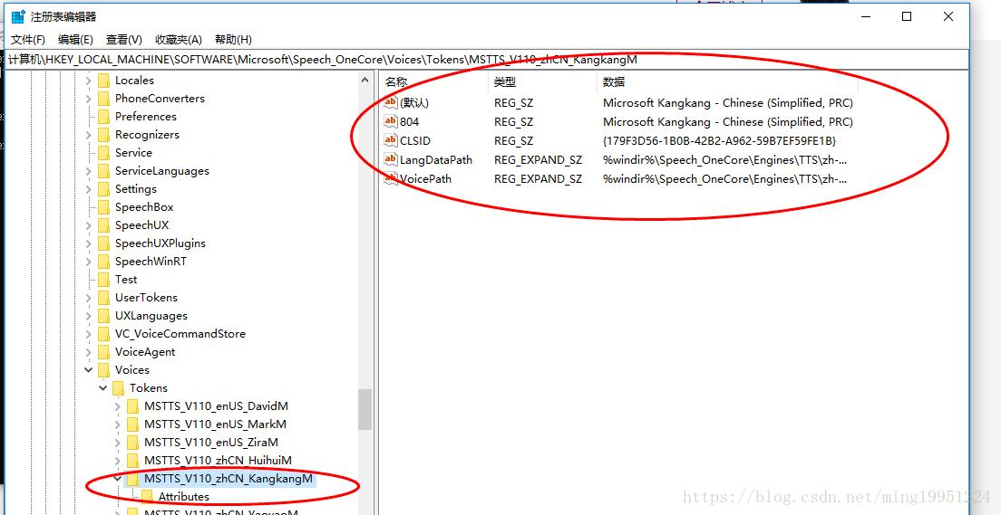 我们先找到\HKEY_LOCAL_MACHINE\SOFTWARE\Microsoft\Speech_OneCore\Voices\Tokens目录,下面是你的系统已经拥有的所有语音库,但是有部分隐藏了,根据需求,把Kangkang这个目录里面的配置和Attribute里面的配置手动添加到HKEY_LOCAL_MACHINE\SOFTWARE\Microsoft\Speech\Voices\Tokens 目录下