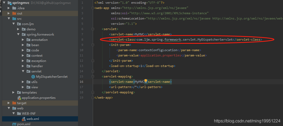 首先需要重web.xml中配置MyDispatcherServlet类和路由绑定。