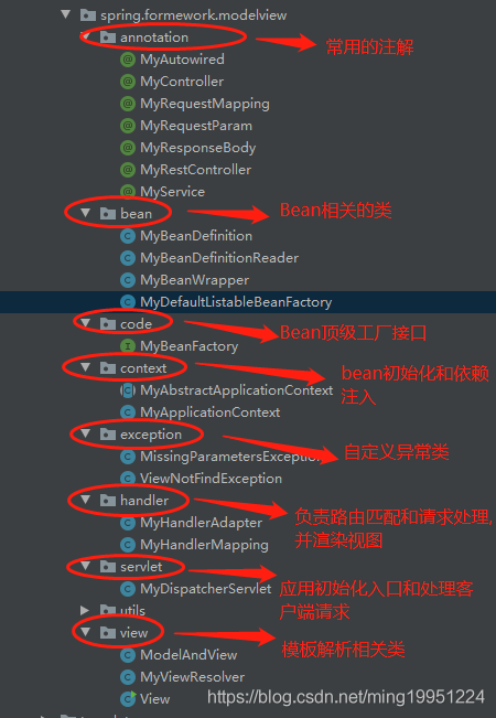 此文基于之前看【Spring5 核心原理】书籍然后综合自己的理解改造了一些功能,简单的概况了springMvc初始化和执行的流程,demo核心的模块如下图
