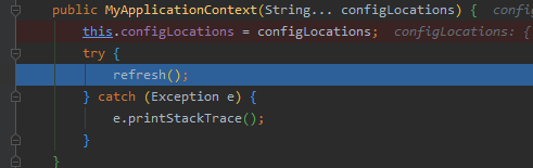 在MyApplicationContext构造函数中会执行refresh()方法,refresh()方法中会进行ioc控制反转和依赖注入方法