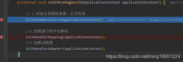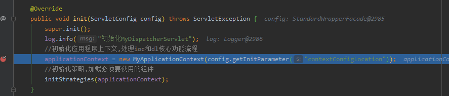 启动应用会访问MyDispatcherServlet的init()方法执行初始化流程,首先会去构建MyApplicationContext实例,通过有参构造函数把application.properties文件的路径传递进去了**