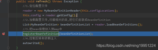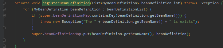 2.2 通过执行MyBeanDefinitionReader的loadBeanDefinitions方法,进行了类的过滤,然后执行registerBeanFefinition方法把信息放入map中