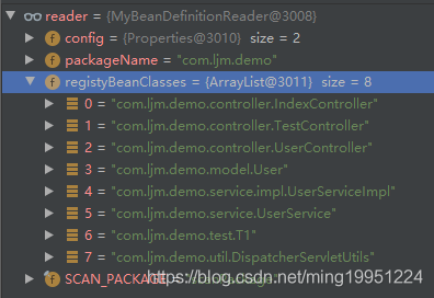 2.1.通过MyBeanDefinitionReader构造,把指定包下的所有类都加到了registyBeanClasses列表中