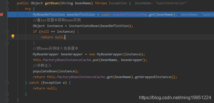 - 5.然后通过instantiateBean方法重ioc容器中获取需要被注入的Bean实例