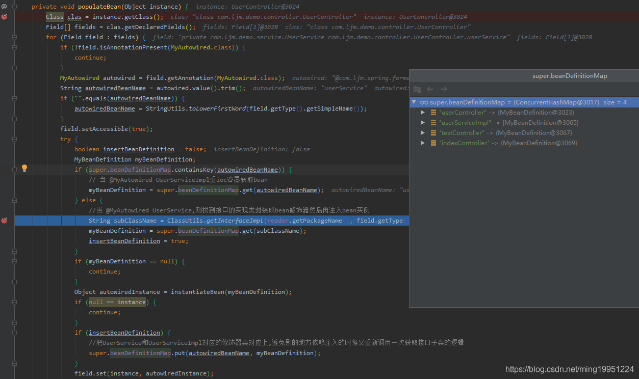 - 4.通过要注入的bean名称去获取对应的Bean配置信息,由于beanDefinitionMap只管理了类信息没有管理类实现的接口信息,当MyAutowired注解注入的是一个接口类型的时候需要通过工具类获取接口的实现类信息