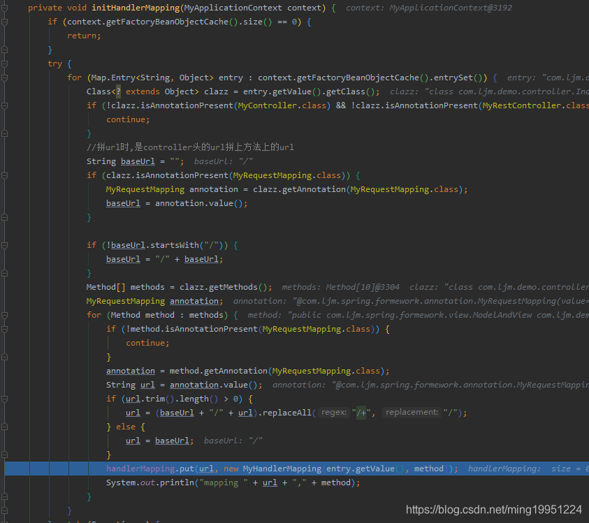 - 4.便利该类的所有方法,处理包含MyRequestMapping注解方法,把方法路由地址然后和类的拼接上,然后封装成MyHandlerMapping对象放入资源路径容器中