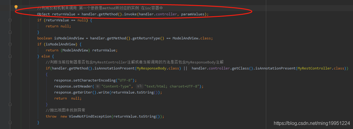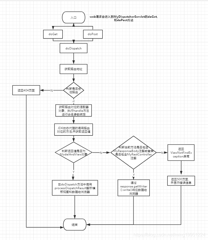 - 7.判断返回值类型,如果不是ModelAndView类型,则判断当前方法是否包含MyResponseBody注解或者类是否包含MyRestController注解,如果包含则通过response.getWriter().write()响应数据给浏览器,不包含则返回ViewNotFindException异常