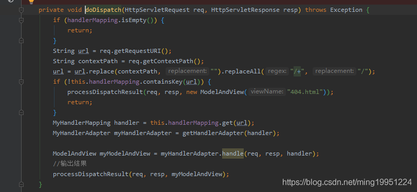 发送post请求后会被MyDispatcherServlet的doPost方法处理,然后doPost委托给doDispatch方法处理