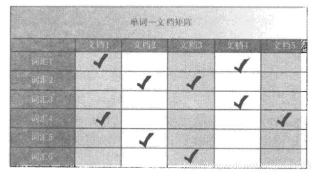 单词-文档矩阵是表达两者之间所具有的一种包含关系的概念模型,图1展示了其含义。图3-1的每列代表一个文档,每行代表一个单词,打对勾的位置代表包含关系。