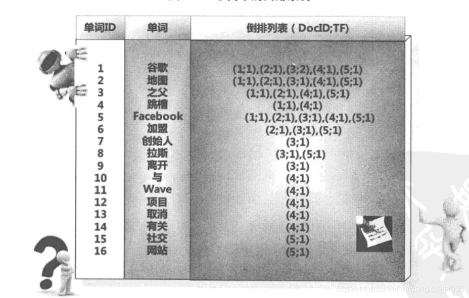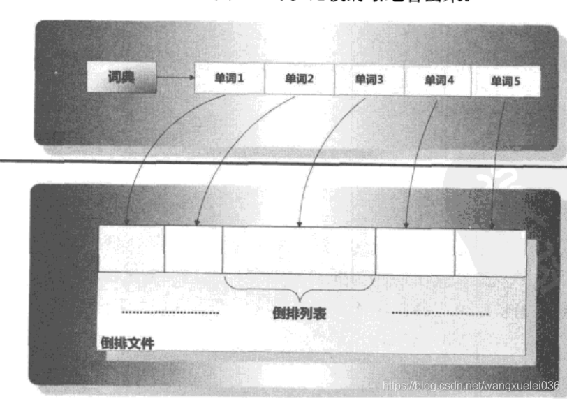 倒排索引(Inverted Index):倒排索引是实现“单词-文档矩阵”的一种具体存储形式,通过倒排索引,可以根据单词快速获取包含这个单词的文档列表。倒排索引主要由两个部分组成:“单词词典”和“倒排文件”。