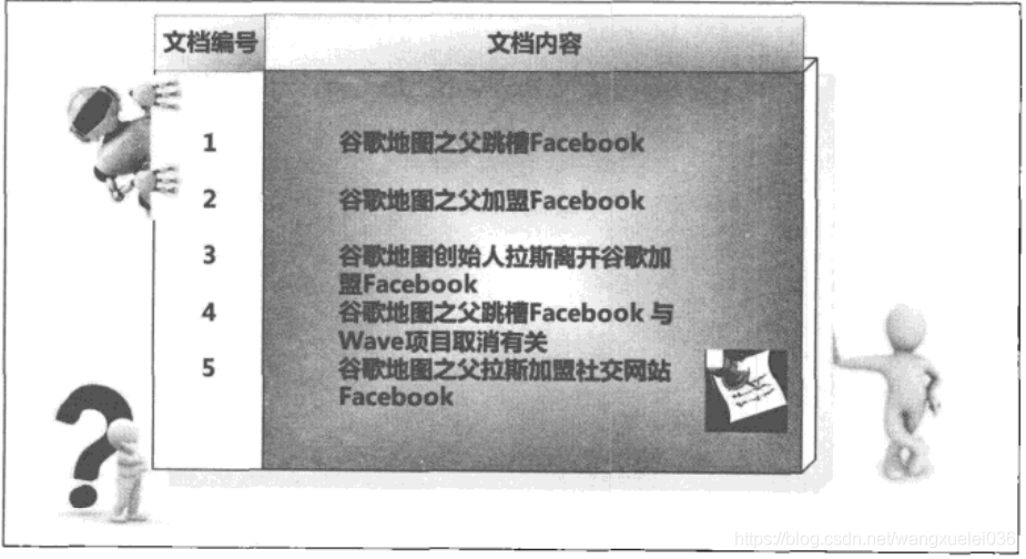 假设文档集合包含五个文档,每个文档内容如图3所示,在图中最左端一栏是每个文档对应的文档编号。我们的任务就是对这个文档集合建立倒排索引。