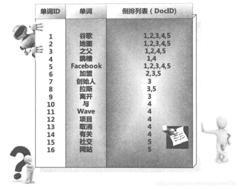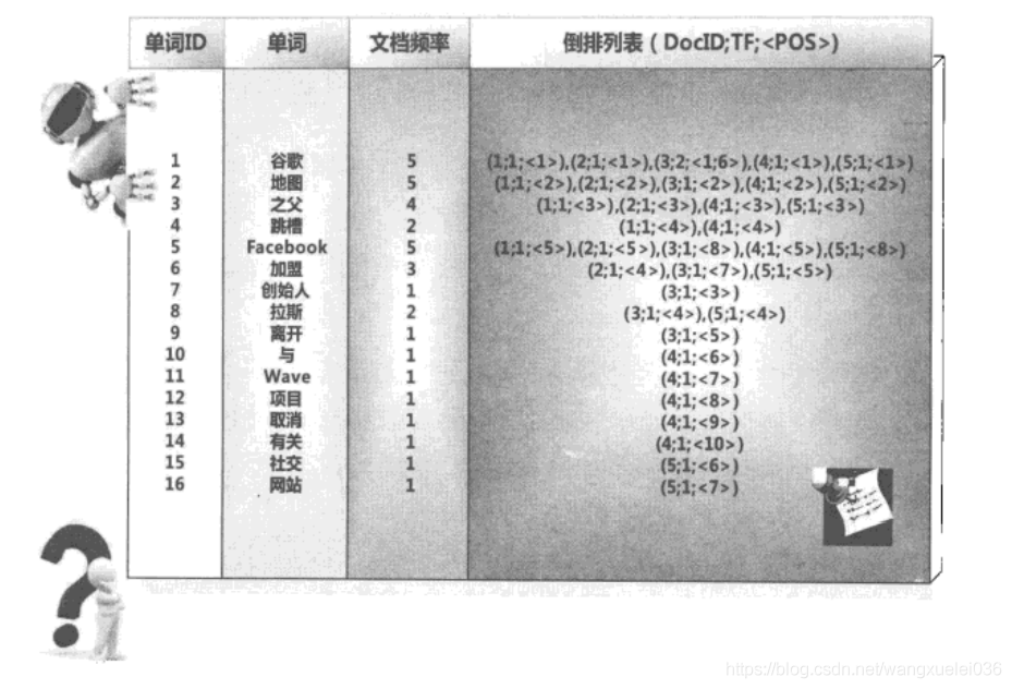 中文和英文等语言不同,单词之间没有明确分隔符号,所以首先要用分词系统将文档自动切分成单词序列。这样每个文档就转换为由单词序列构成的数据流,为了系统后续处理方便,需要对每个不同的单词赋予唯一的单词编号,同时记录下哪些文档包含这个单词,在如此处理结束后,我们可以得到最简单的倒排索引(参考图3-4)。在图4中,“单词ID”一栏记录了每个单词的单词编号,第二栏是对应的单词,第三栏即每个单词对应的倒排列表。比如单词“谷歌”,其单词编号为1,倒排列表为{1,2,3,4,5},说明文档集合中每个文档都包含了这个单词。