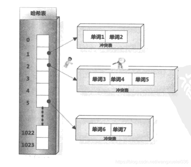 主体部分是哈希表,每个哈希表项保存一个指针,指针指向冲突链表,在冲突链表里,相同哈希值的单词形成链表结构。之所以会有冲突链表,是因为两个不同单词获得相同的哈希值,如果是这样,在哈希方法里被称做是一次冲突,可以将相同哈希值的单词存储在链表里,以供后续查找。