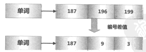 文档编号差值是倒排索引列表中相邻的两个倒排索引项文档编号的差值,一般在索引构建过程中,可以保证倒排列表中后面出现的文档编号大于之前出现的文档编号,索引文档编号的差值总是大于0的整数。如下图,将原始的文档编号为187,196,199,通过编号差值计算,转为:187,9,3