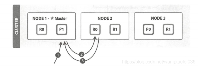 (2)NODE1是同文档ID来确定文档属于分片0,通过集群状态中的内容路由表信息获取分片0有三个副本数据,位于三个节点中,此时它可以通过将请求发送到任意节点,图上所示是将请求发送到NODE2。