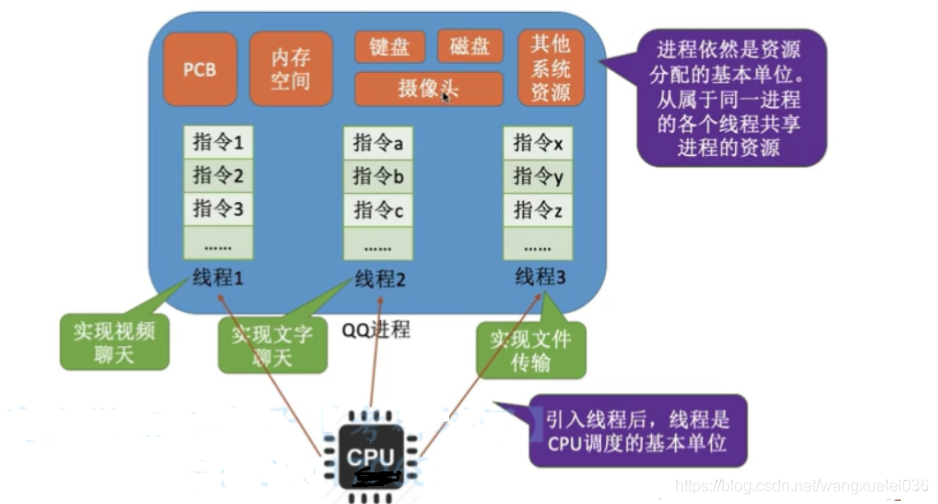 引入线程之后,进程是资源分配的基本单位。而线程几乎不拥有资源,只拥有极少量的资源(线程控制块TCB,寄存器信息,堆栈等),线程是调度的基本单元