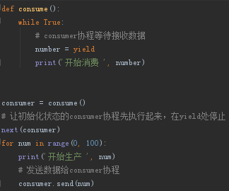 由于Java的原生语法中并没有实现协程(某些开源框架实现了协程,但是很少被使用),所以我们来看一看python当中对协程的实现案例,同样以生产者消费者模式为例: