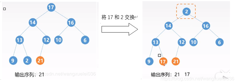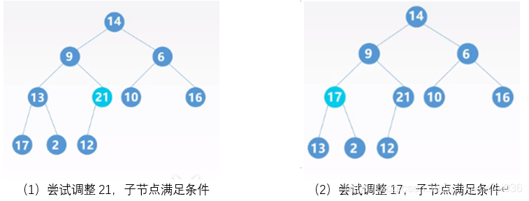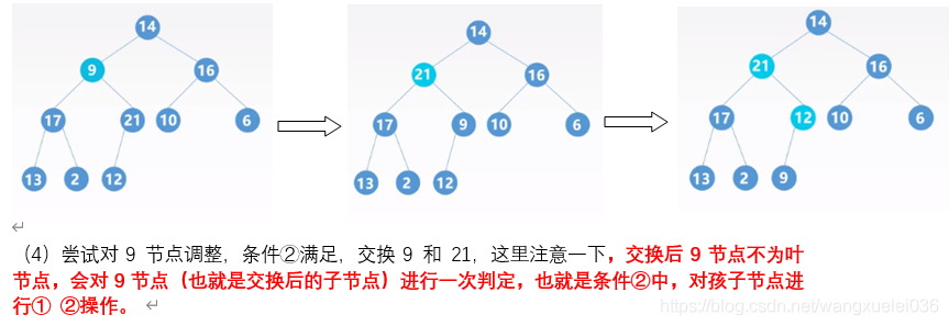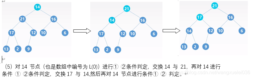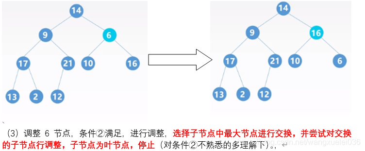 ②若存在孩子节点大于双亲节点,则将最大的孩子节点与父节点交换,并对该孩子节点进行① ②操作,直到出现①或到叶节点为止。