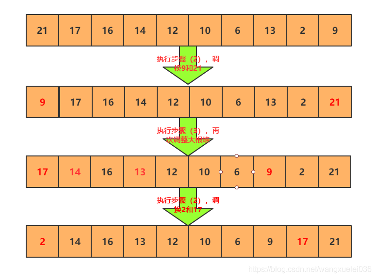 (2).将顶端的数与末尾的数交换,此时,末尾的数为最大值,剩余待排序数组个数为n-1