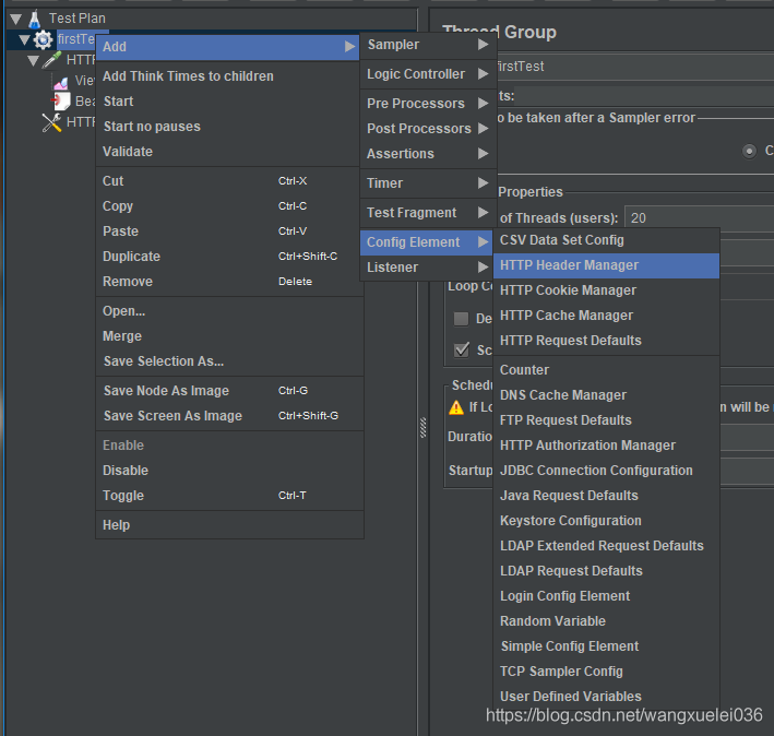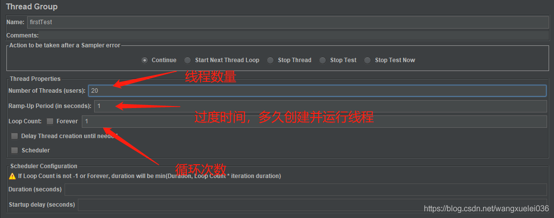 设置线程数和循环次数。我这里设置线程数为20,循环一次。