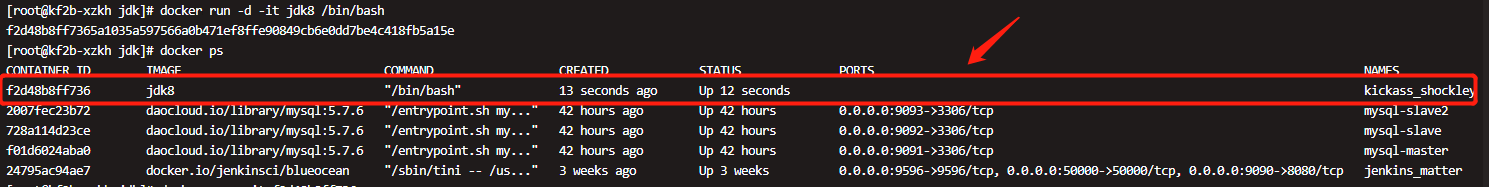 docker run -d -it jdk8 /bin/bash 上面包含两条指令,run创建容器和查看容器。