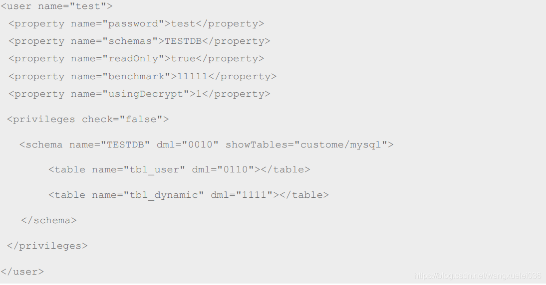 这里我们简单使用账户密码 使用如下配置 :就是设置账号,主要是schemas 属性 要与之前schema.xml 中定义的逻辑库对应