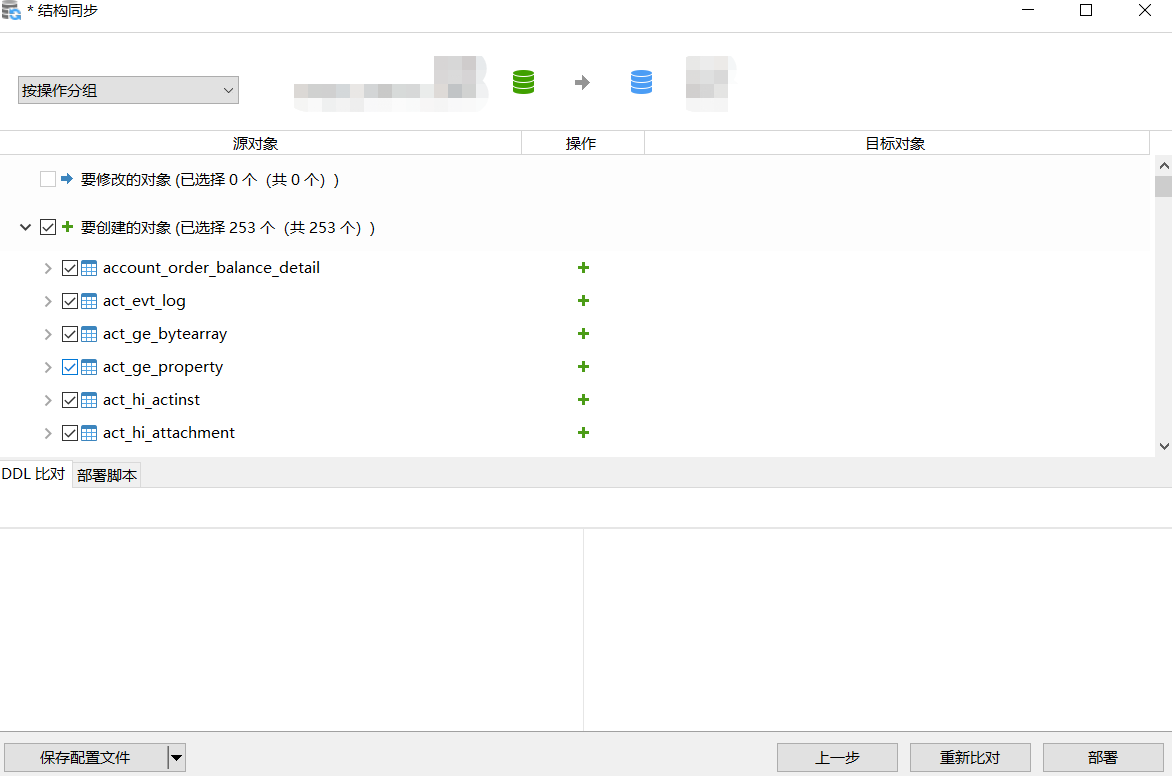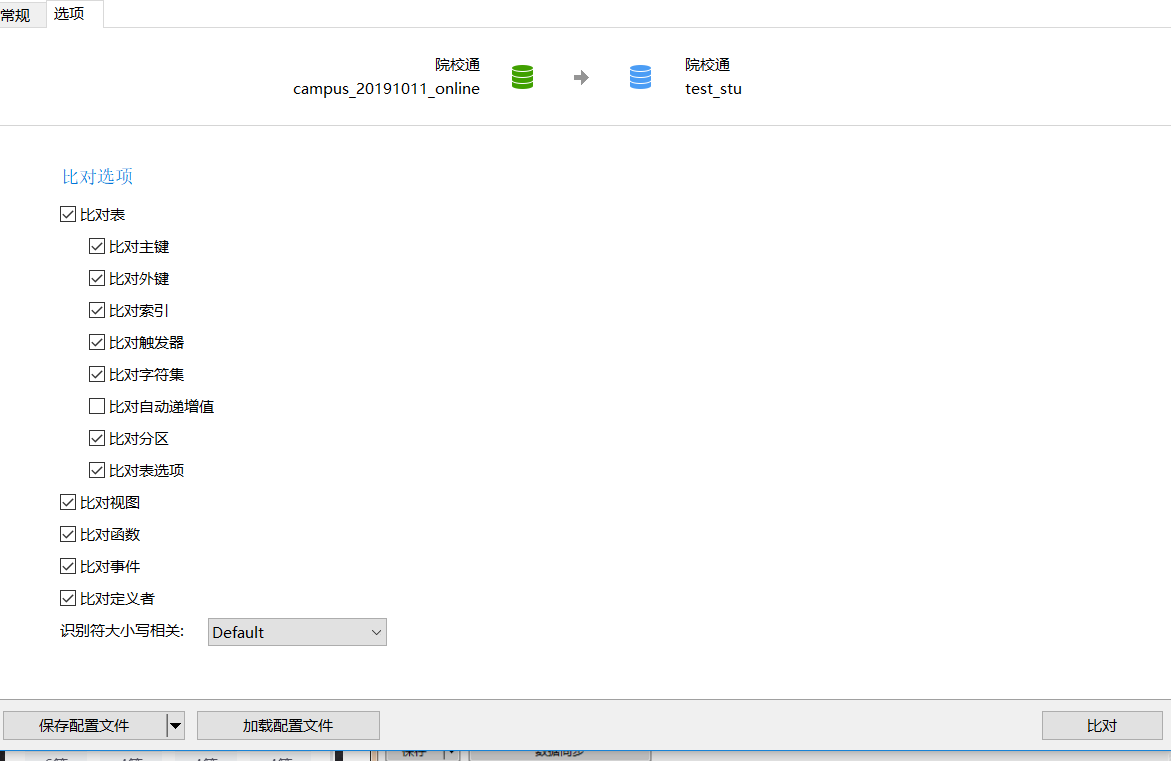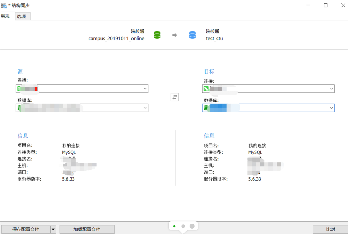 选择资源数据库 -> 目标数据库 选择完以后,会显示对应的数据库信息。 (注:最好在克隆或者备份的时候进行一次备份,避免意外情况),也可以根据自己的需要调整对比的选项