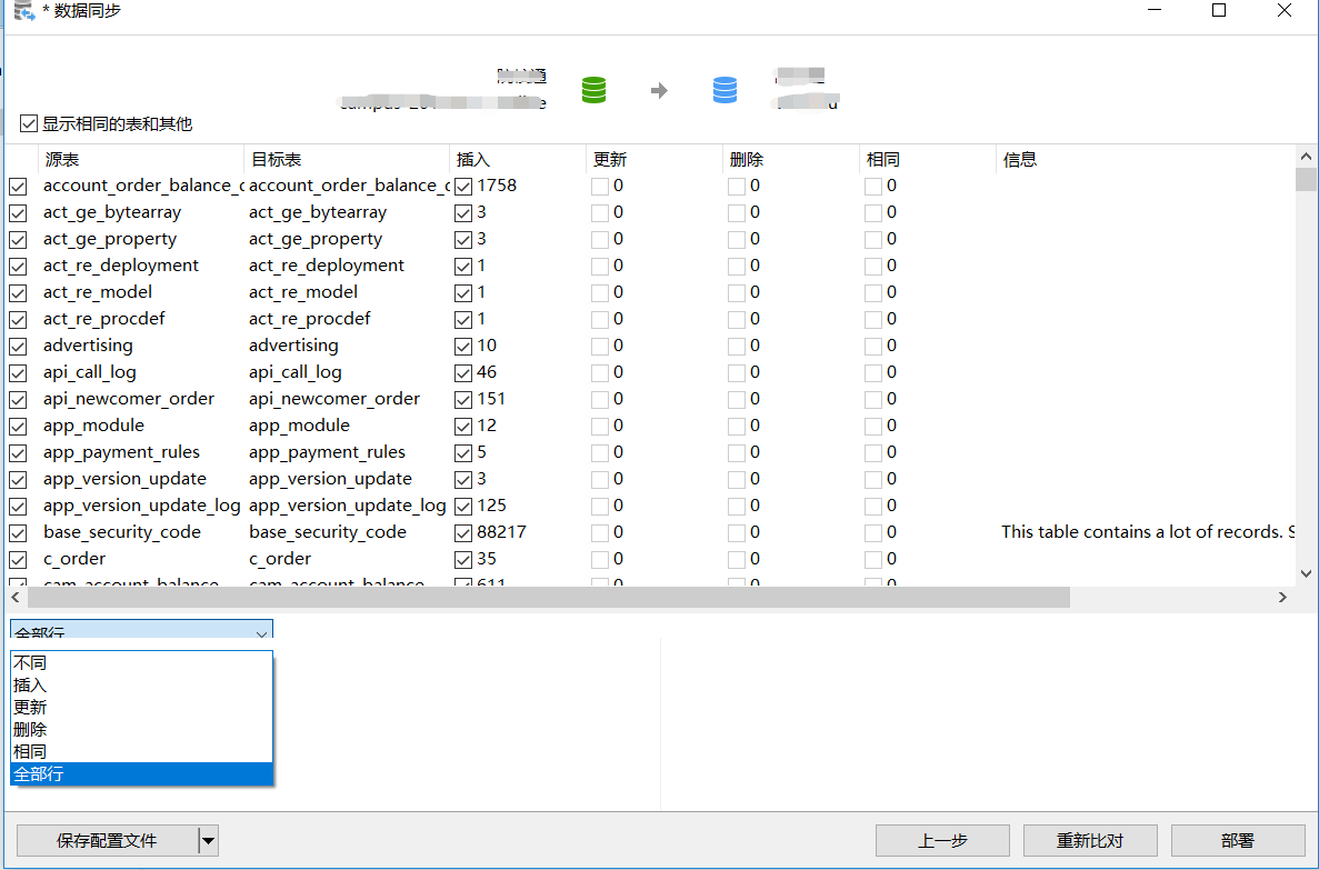 比对完成后,可以进行选择性同步数据的一些选项