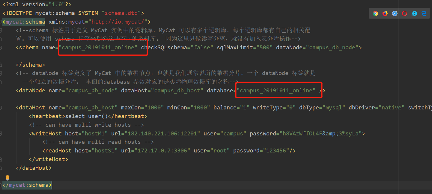 那么我们就修改相应的配置,将逻辑库名称和物理库名称对应,注意同时要修改server.xml中配置信息