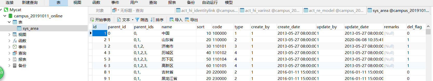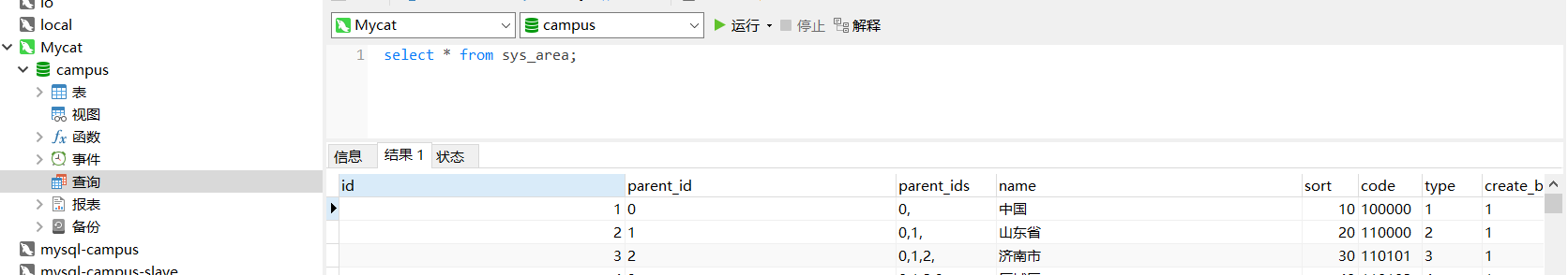 因为在mycat中配置的逻辑库名称为 campus,但是我的真是物理课名称为 campus_20191011_online,怀疑是 图形工具双击查询的时候,使用的是campus.sys_area(库名.表名)进行查询,但是实际物理库却没有该库