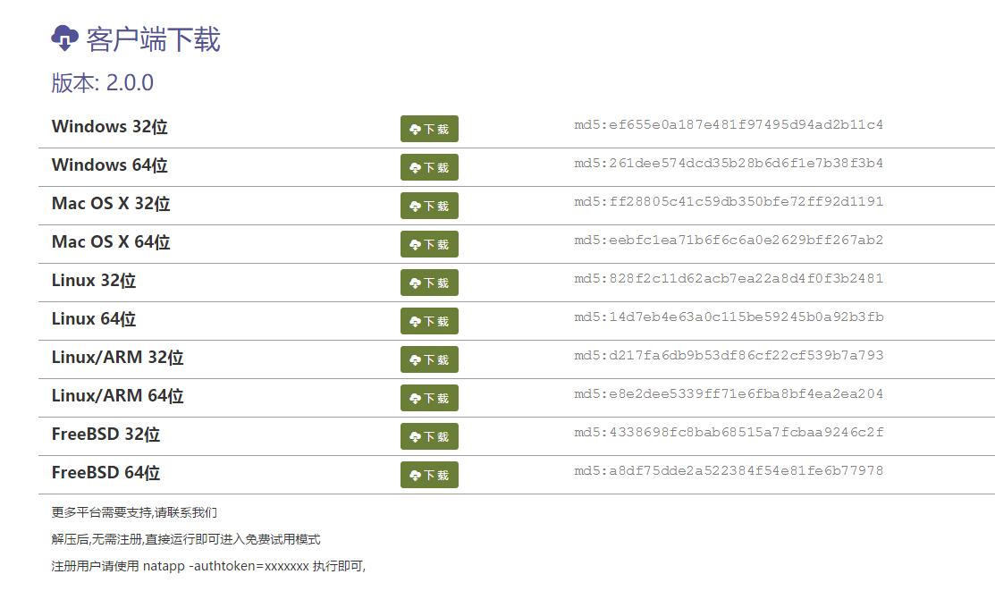 5.在 natapp.cn 根据您的本机下载对应的客户端,比如我的本机是win10,64位,则下载Windows 64位的客户端
