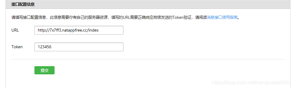 1.先进行接口配置信息的提交,这里点击提交的时候会去校验你的服务接口,详细的可以点击 消息接口使用指南了解,这里我把关键的地方截图出来
