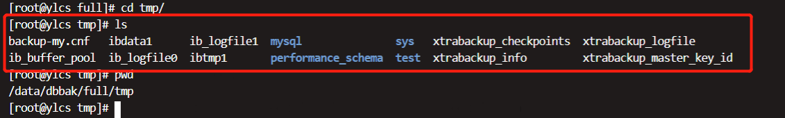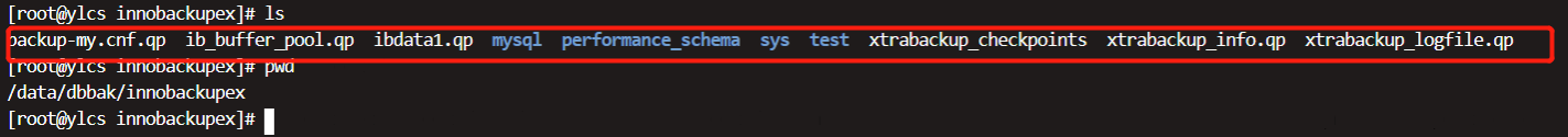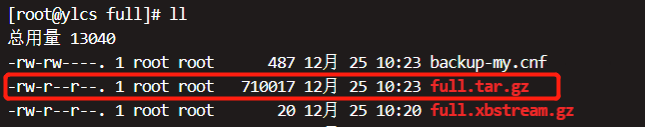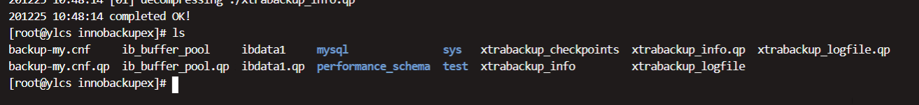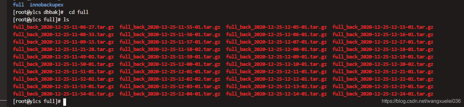innobackupex --defaults-file=/etc/my.cnf --host=localhost --user=root --password=123456 /data/dbbak/innobackupex/ --no-timestamp --compress --compress-threads=5 这里还是很多文件啊 可以自己打包一下,当然后面我还会介绍直接压缩成一个tar包的方式