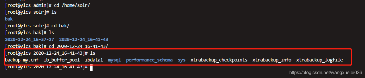 innobackupex --defaults-file=/etc/my.cnf --user=root --apply-log /home/solr/bak/2020-12-24_16-41-43/ 再拷贝数据