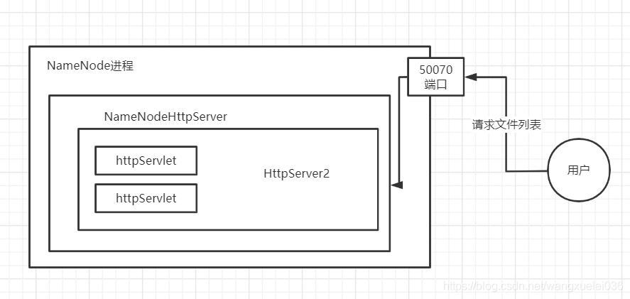 NameNodeServer :NameNodeHttpServer、NameNodeRpcServer,http请求,rpc请求,datanode、dfsclient都可以来请求他们,比如说请求这两个server来创建目录、上传文件、下载文件、dfsadmin管理性的操作