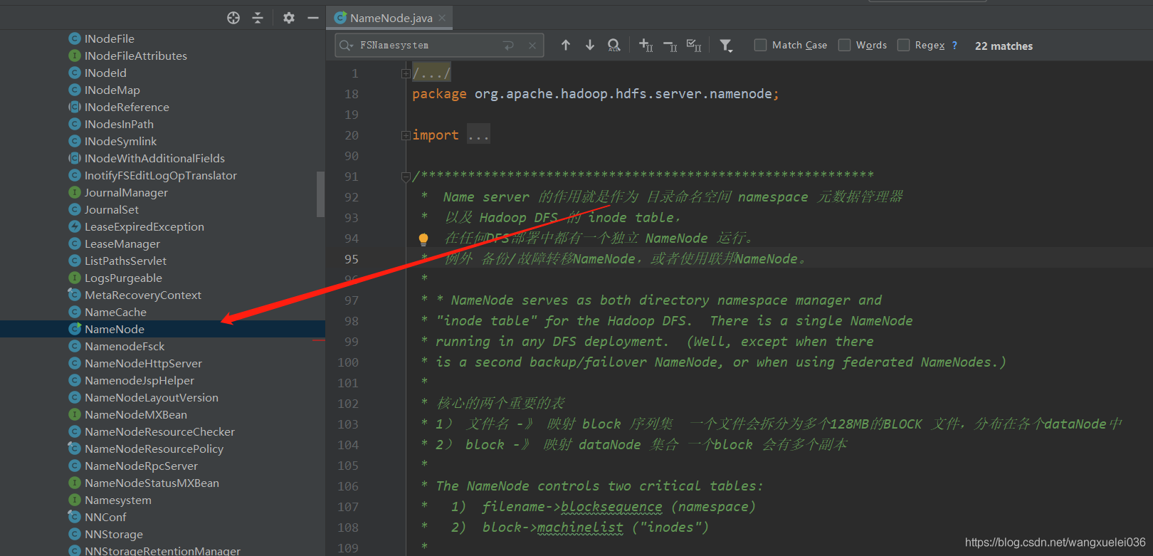 然后我们又看到了几个比较核心的关键词 : NameNode、NameNodeServer、FSNamesystem。其实也就是比较核心的几个组件概念