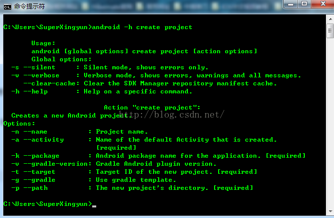 -h --help : Help on a specific command.<span style="color:#009900;">/* 显示android.bat 帮助信息 */