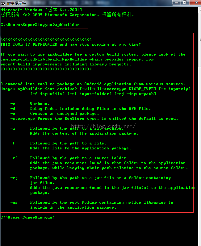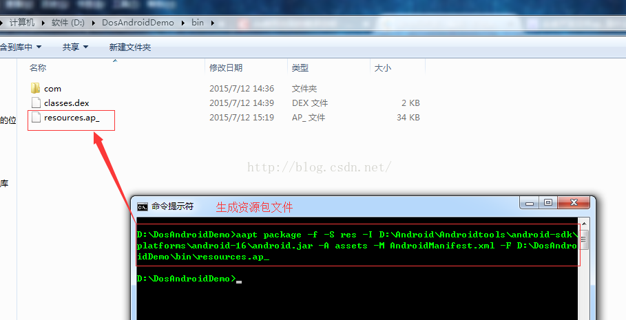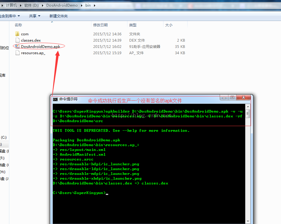 apkbuilder D:\DosAndroidDemo\bin\DosAndroidDemo.apk -v -u -z D:\DosAndroidDemo\bin\resources.ap_ -f D:\DosAndroidDemo\bin\classes.dex -rf D:\DosAndroidDemo\src 参数说明: