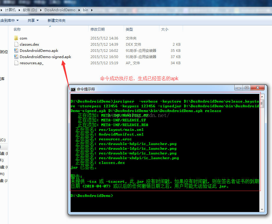 jarsigner -verbose -keystore D:\DosAndroidDemo\release.keystore -storepass 123456 -keypass 123456 -signedjar D:\DosAndroidDemo\bin\DosAndroidDemo-signed.apk D:\DosAndroidDemo\bin\DosAndroidDemo.apk release