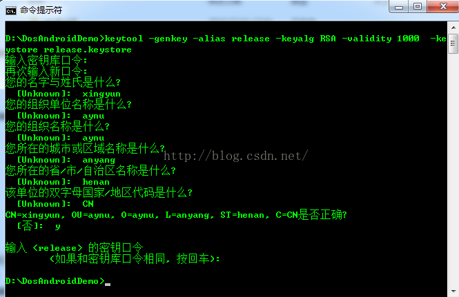 keytool -genkey -alias release -keyalg RSA -validity 1000 -keystore release.keystore 3.8 通过jarsigner命令签名