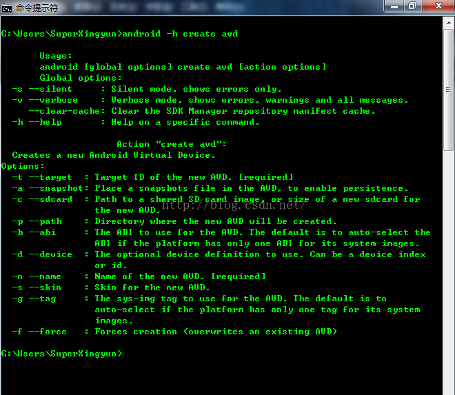 -h --help : Help on a specific command./* 显示android.bat 帮助信息 */我们再看后半部分:Action "create avd": Creates a new Android Virtual Device.