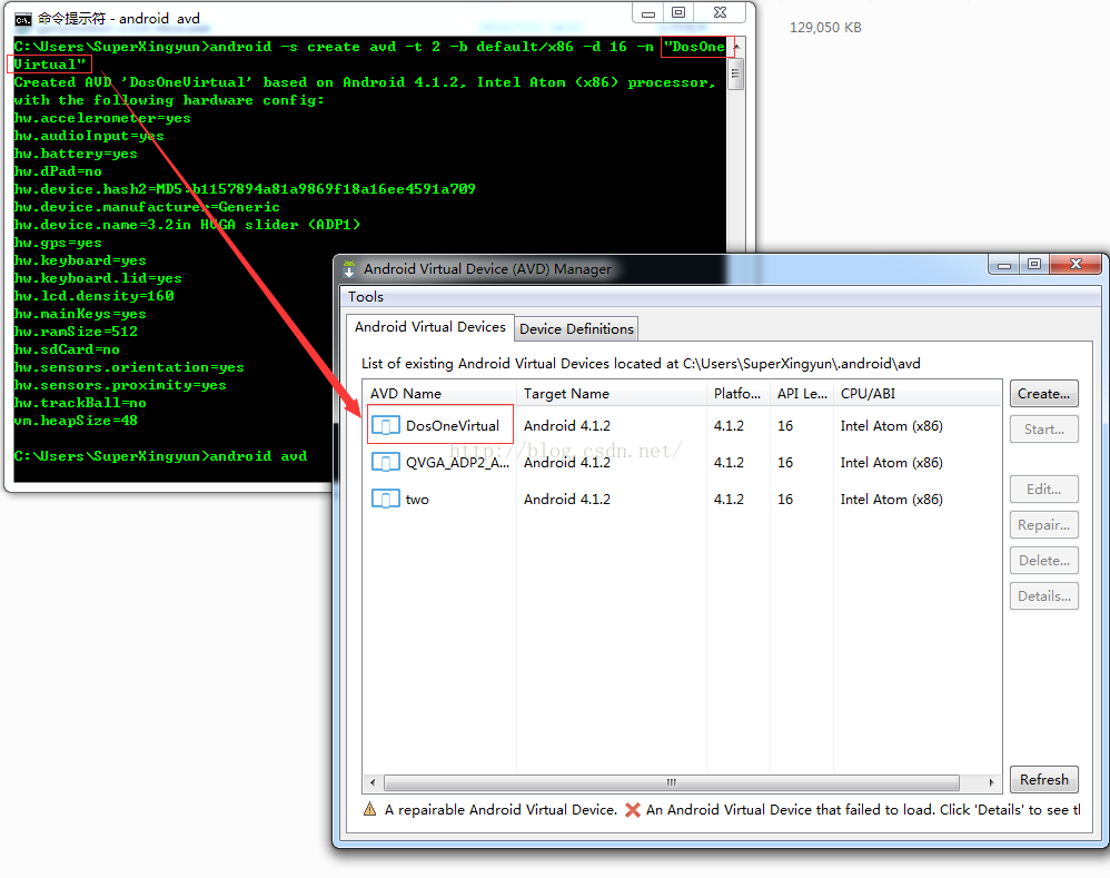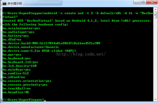 现在我想通过命令行创建一个Android 4.1.2 版本16的模拟器,取名字为“DosOneVirtual”