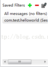 目前只有两个过滤器,All messages 过滤器也就相当于没有过滤器,会把所有的日志都显示出来。com.test.helloworld 过滤器是我们运行 HelloWorld 项目时自动创建的,点击这个过滤器就可以只看到 HelloWorld 程序中打印的日志。那可不可以自定义过滤器呢?当前可以,我们现在就来添加一个过滤器试试。