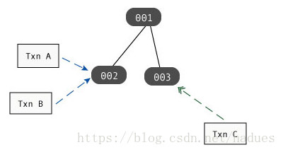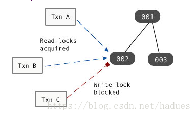 在下图中,Txn A和Txn B都在记录002上保持读锁定,而Txn C在记录003上保持写锁定: