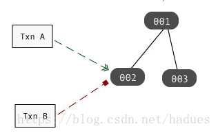 例如,如果Txn A在记录002上保持写锁定(独占锁定),则如果Txn B尝试在该记录上获取读取或写入锁定,则阻止运行Txn B的控制线程: