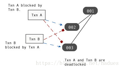 例如,如果Txn B被Txn B阻塞,同时Txn B被Txn A阻塞,那么包含Txn A和Txn B的控制线程就会死锁; 两个线程都不能进行任何前进,因为这两个线程都不会释放阻塞其他线程的锁。