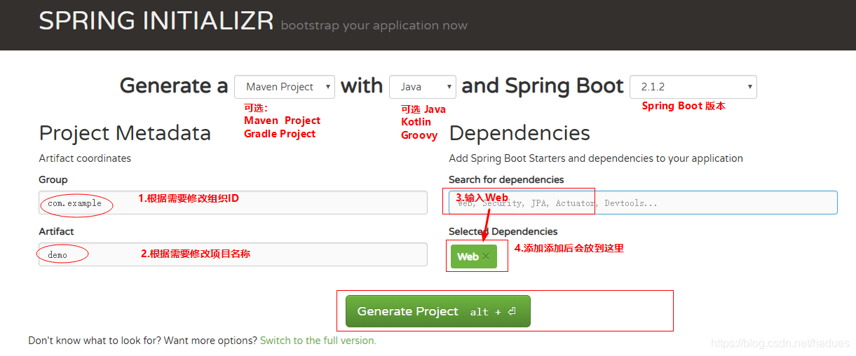 - 快速构建我们的应用程序可以使用这个网址 https://start.spring.io/